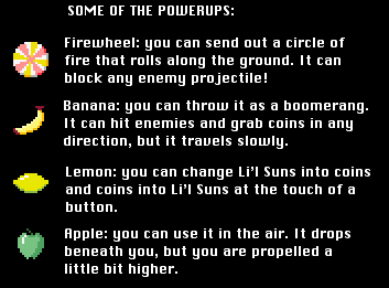 Powerups other than the apple have unlimited uses, but you can only carry one. The firewheel candy is directly taken from The Great Giana Sisters. The banana is, of course, Zelda Classic's built-in boomerang from The Legend of Zelda.
