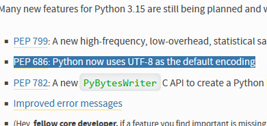Was casually reading the announcement for Python 3.15 when I stumble on this line. I don't use the language too frequently, but it's nice to know all those times I was compulsively splashing encoding="utf8" everywhere were actually freaking required until now.