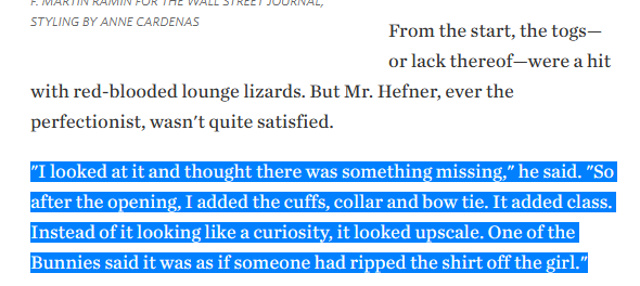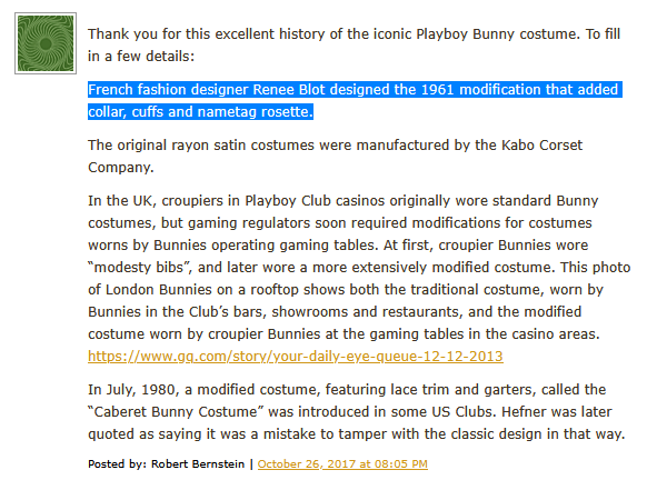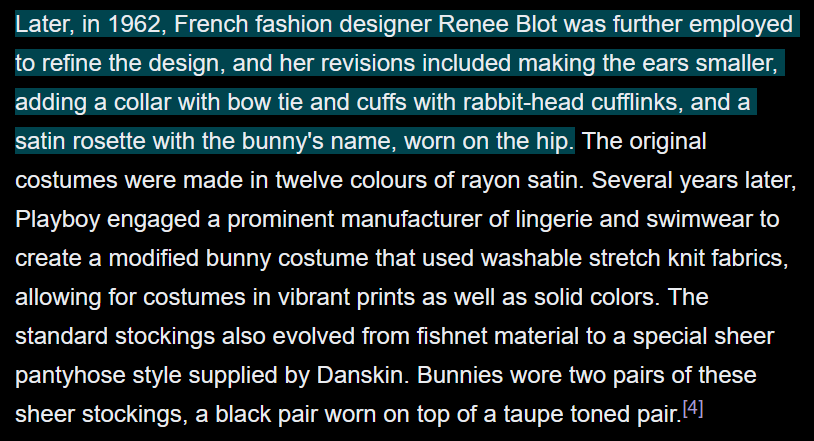Tried to look up who came up with - specifically - the idea for giving the Playboy bunny costume sleeve-cuffs attached to nothing. Wikipedia says it was added in 1962 by Renee Blot, but the only other source I could find for this is a 2017 blogspot reply. http://web.archive.org/web/20180305164225/https://blog.fidmmuseum.org/museum/2017/09/a-colony-of-colors-the-iconic-playboy-bunny.html