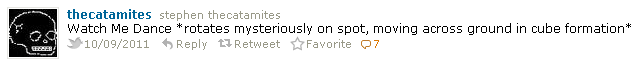 http://l.j-factor.com/misc/thecatamites.zip - Several hundred thecatamites tweets I ripped from topsy .com, which has mirrors of everyone's tweets for some reason.