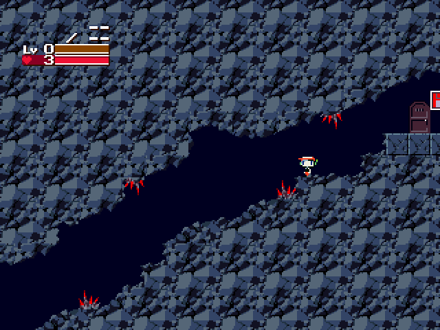 Malicious auto-scrolling screen pushes you away from powerups, slows fiendishly near rising lava, tries to crush you against the floor often