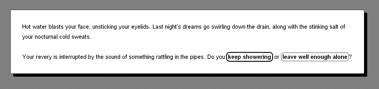 It occurs to me that in Twine you can roughly replicate Jonah's stretchtext in Sugarcane by combining my <<replace>> macro with <<display>>.