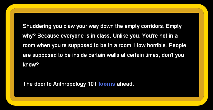 You wake up. All your body parts have been rearranged in alphabetical order. "You're awake" says the librarian, her mouth on her midsection.