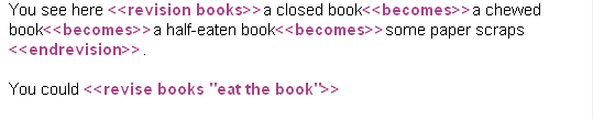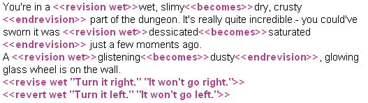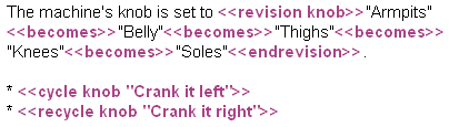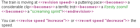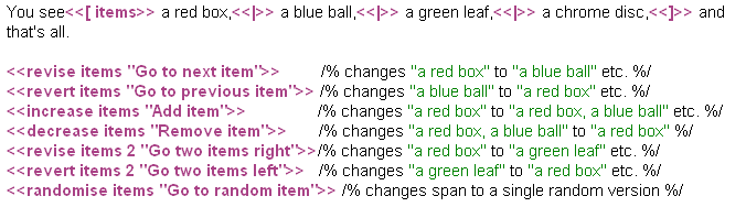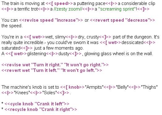 http://www.glorioustrainwrecks.com/node/5239 - Updated my <<revision>> Twine macro, enhancing <<revise>> with various <<cyclinglink>>-style text options.