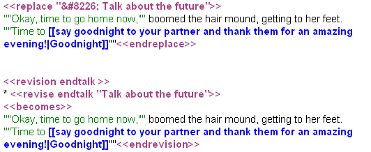 http://www.glorioustrainwrecks.com/node/5019 - Updated the <<replace>> macro, adding <<continue>>, which is a variant that doesn't need a matching <<endreplace>>.