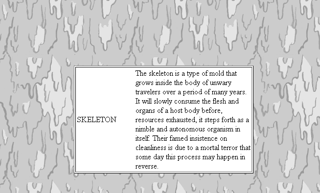 "DEATH-AREA facts: 1) Rains tiny femurs instead of raindrops. 2) All musical instruments sound like electric guitars for some reason."
