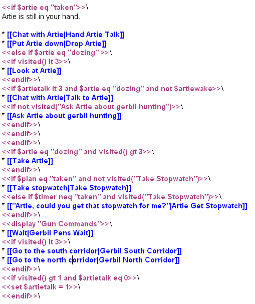 It's also an experiment to make a "traditional" parser-style IF puzzle in Twine, inspired by Rematch and All Things Devours and all that.