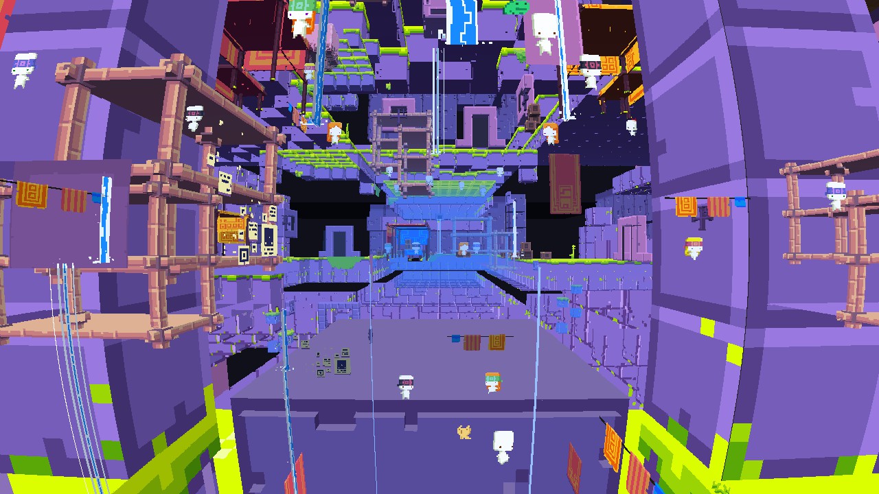 NPCs swarm the player, eager to welcome them into the game, to lead them to the giant birthday party they set up - "no peeking!" they say.