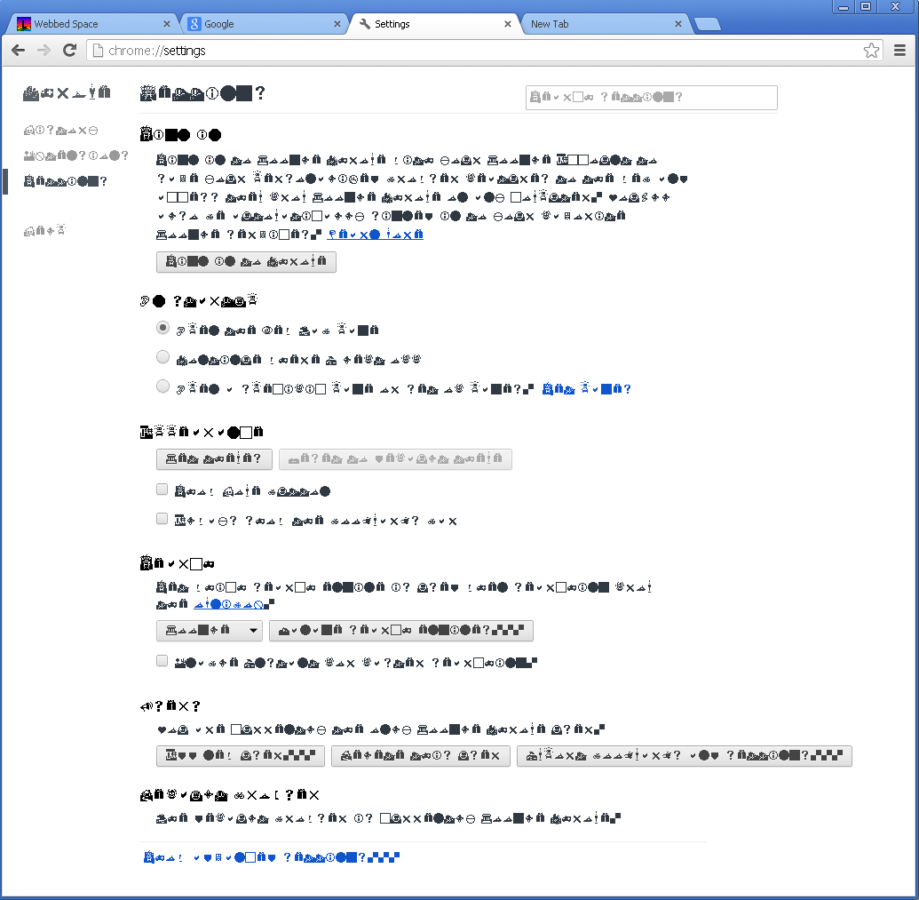 OF COURSE putting " * { font-family: "Webdings" !important; }" in your Custom.css also affects Chrome's settings page
