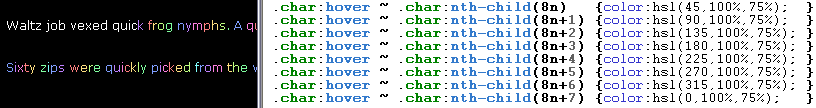 More messing around with CSS. (I'm using http://en.wikipedia.org/wiki/List_of_pangrams#Longer_pangrams_in_English_.28in_order_of_fewest_letters_used.29 for sample text.)