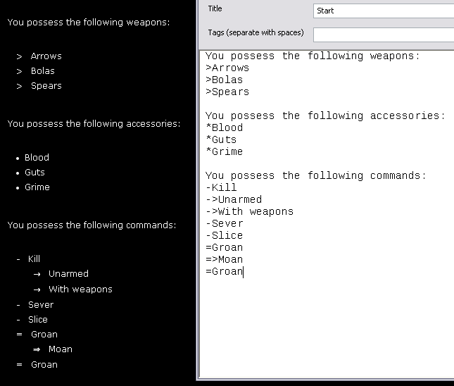 I'm contemplating introducing these variant Twine bullet points. Some of the later ones may be too extravagant.