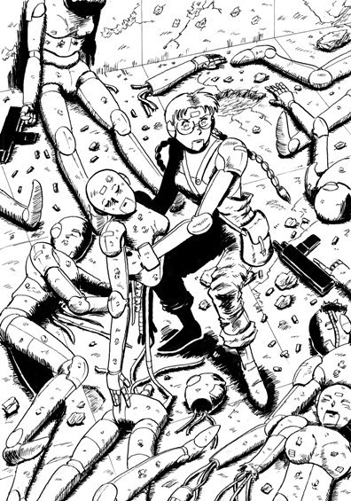 Too late do you recall that the factory's assembly lines all have huge buzzsaws at human head-height, in anticipation of this very escapade.
