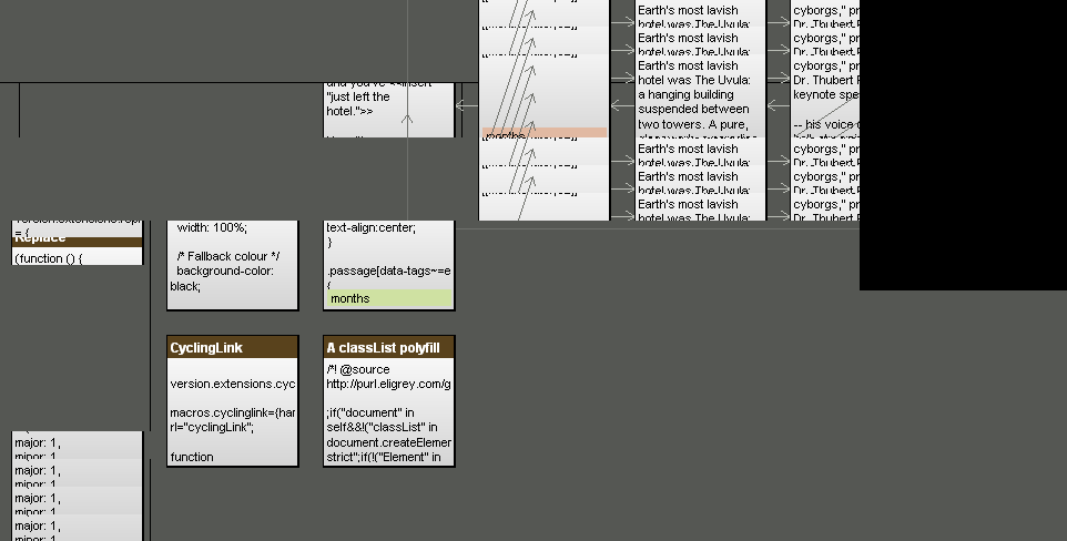 Regarding http://philome.la/2sman2sman/10print-ported-to-twine: Just now I tried to see if the Twine 2 preview would allow you to easily make a "real" randomised 10PRINT.