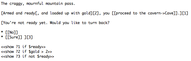 Another Twine 2 syntax thought… Some alternative to <<if>> that uses hooks, and puts the conditions in footnotes.