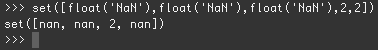Inspired by this tweet https://twitter.com/eiridescent/status/459027039626854400 I checked and #TIL that Python 2's sets can store multiple NaNs.