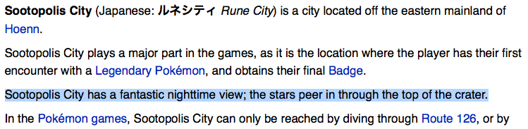 The one thing I genuinely like about the remade Ruby and Sapphire games is their referring to Sootopolis City citizens as "Sootopolitans".