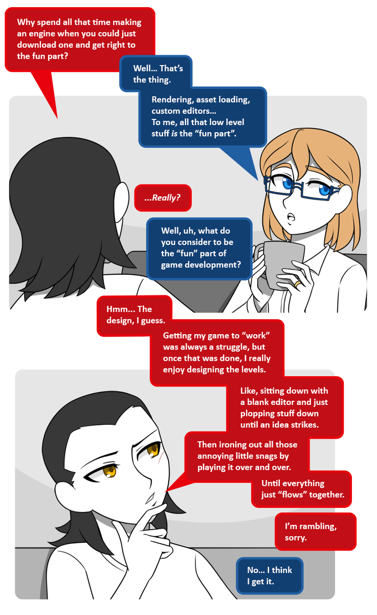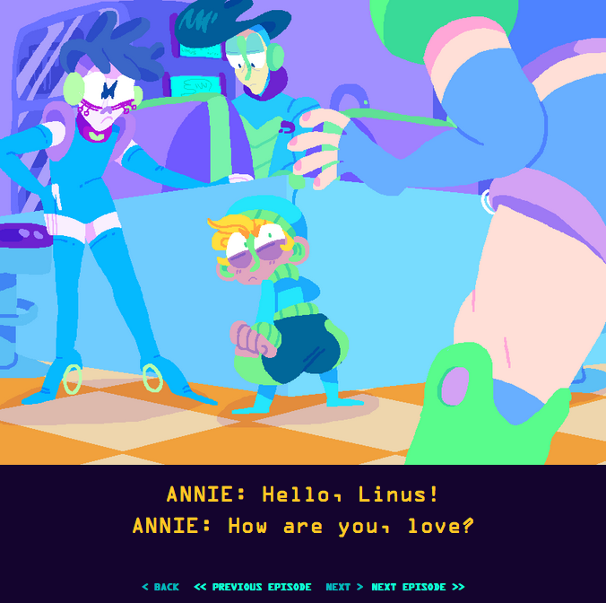 http://makingofneon.com/ – This webcomic is just pages of dry, informational conversation about game programming minutiae, and I'm glad despite each page's information stirring complicated feelings in me.