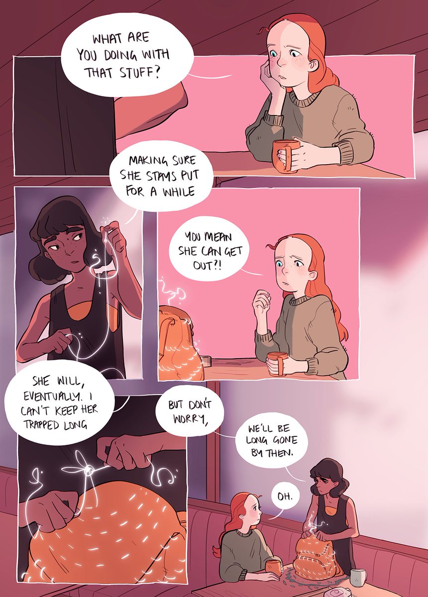 http://mimoncomic.tumblr.com/ – Only 40 pages yet, and rather slow-paced at that, but great complementary colour schemes and nicely Emily Carroll-esque linework.