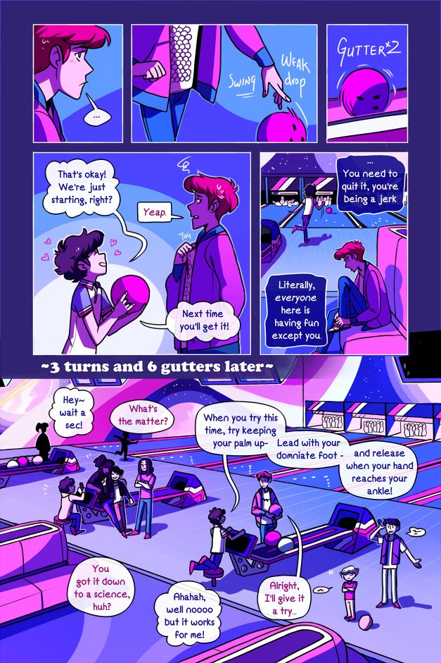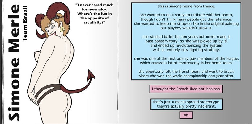 The main character's voice carries this comic… The first chapter has two whole pages of her infodumping about sports mecha pilots while flipping through their nudes in a porn magazine, and is one of the most enchanting sequences I've read in a while.