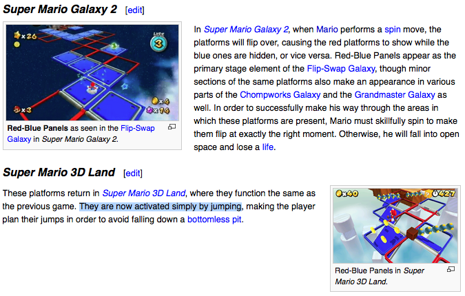 Here's a hilariously sharp contrast between the Galaxy games and 3D Land: these reactive swapping tiles seem similar but are actually completely different between the games – forgettable in the former, brilliant in the latter.