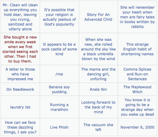 I may've mentioned before about Everything2's (https://everything2.com/) node names as an idiosyncratic prose form, but I also recall that they form rather pretty structures in the "related node" tables at the foot of each page - their common themes usually lending them synergy.