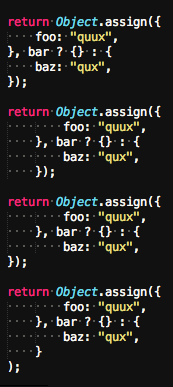 Every so often I rattle out a Javascript idiom that doesn't comfortably fit K&R C-inspired indentation intuitions. Like this: which of these four options do you feel is the Most Correct Indentation?