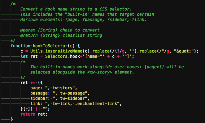 If any programmers out there want to do a tribute album of their favourite functions from any of my codebases, they have my best wishes. Here's an oldie from Twine 2 that I still like.