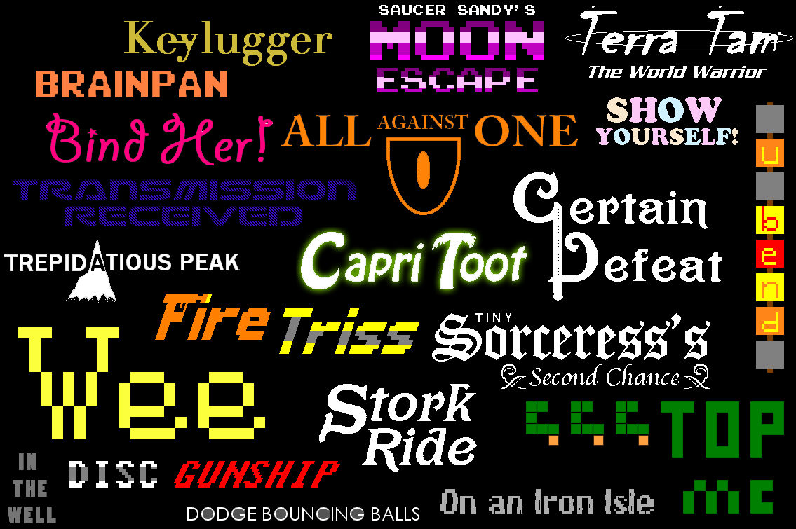 This is a montage of some title logos for the Game Maker games I've made. It's easy for someone like me to get discouraged about my future, but maybe I could do with more vainly remembering my past. Nothing like trying on the monarch's garments of brand-worship in the mirror, eh?