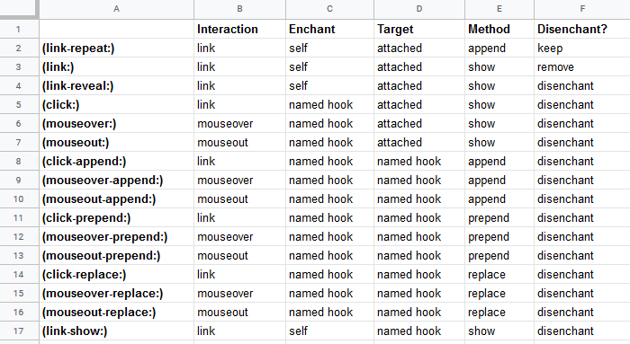 The "disenchant" column is what's maligning me… There's really no easy way to specify in the macro name whether you want the link text to disappear or become normal… Ink's use of [square brackets] to specify removed text among the link text has been taunting me for a while…