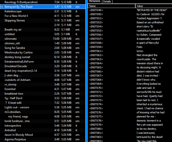 Browsing the MODArchive 2007 torrent by filesize is rather wild. This (https://modarchive.org/index.php?request=view_by_moduleid&query=141984) 5MB xm file is a death metal track with fully voiced lyrics, and built-in liner notes in the instrument names.