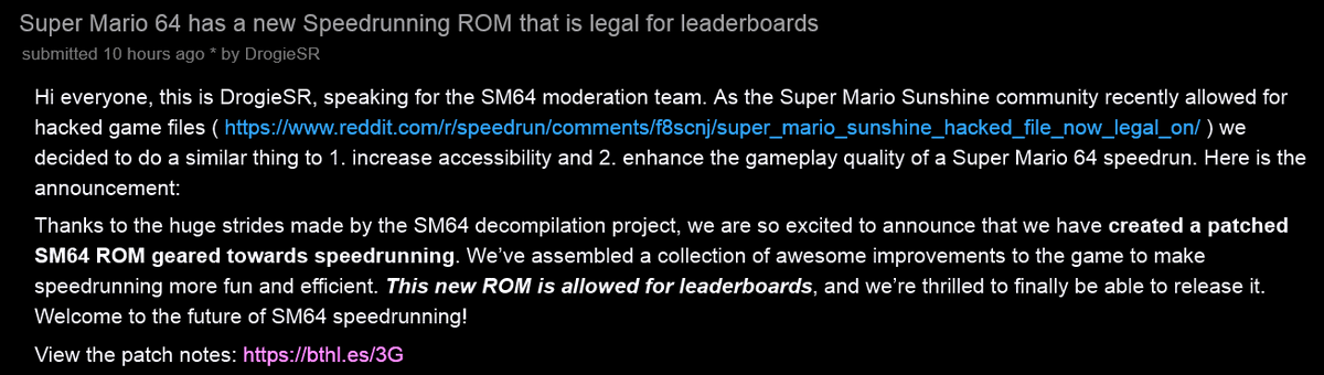 https://old.reddit.com/r/speedrun/comments/ft46il/super_mario_64_has_a_new_speedrunning_rom_that_is/ – Today, in April Fools jokes