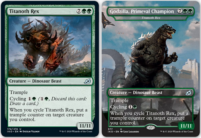 Here's how it works: both of these cards are named "Titanoth Rex" (this is important for the four-of-a-kind deck construction rule) but one of them depicts a completely different character and has a non-functional "name" where its name usually is. Unbearable. Illegible.