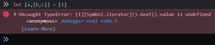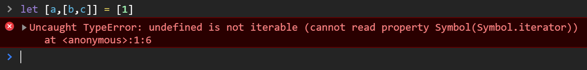 Decided to see what Javascript destructuring error messages actually look like, and: are you kidding me? Are you kiddifying me? Are you babygoating me? I know exactly what this means from poring over the ES6 spec, and it still barely makes sense.