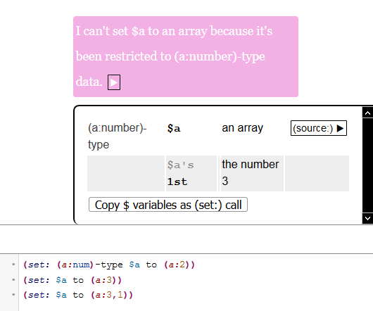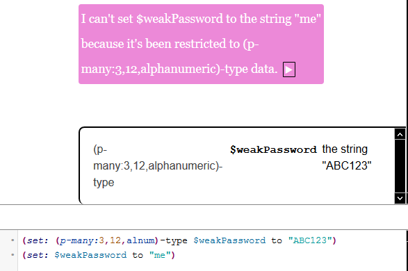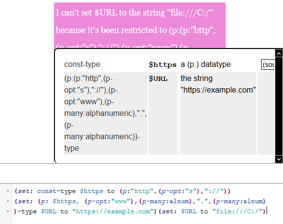 Harlowe (Twine story format) status: you can now set regexps (or rather, my barely more beginner-friendly string datatype macros) as the types of variables. Notice in the second example that you can construct these using constituent parts saved in earlier variables.
