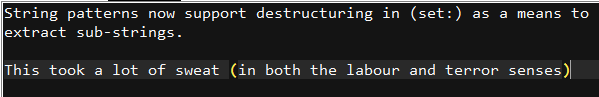The big idea I'm working on now is that instead of specific re.exec() methods to extract matches, you can "just" use destructuring assignment, such as