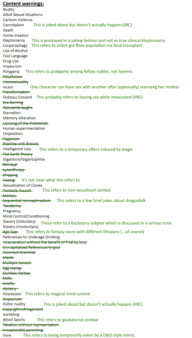 One final note: the game comes with a file listing various "Content Warnings" for the story. I've crossed out all the entries I'm convinced are jokes (or listed insincerely) and added my own (opinionated) remarks about ones which I believe are slightly or strongly misleading.