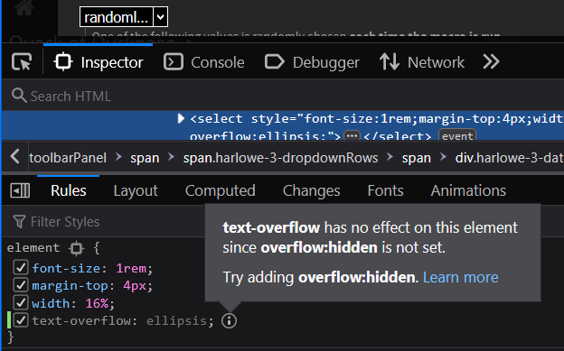 Firefox bug detected: the information bubble and graying-out of this CSS property is actually incorrect, as text-overflow is used for <select> elements with a limited width, even without overflow:hidden.