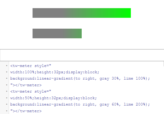 Issuing myself a Satisfaction Emotion because I deduced, without external assistance, that the way to clip CSS linear gradients, as one would use when constructing a videogame health bar, is to multiply their colour stops so that they extend beyond 100%.