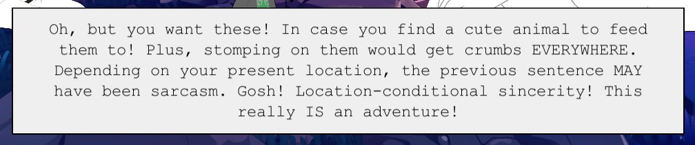 That being said, though… I actually think this isn't that big of a wound on this game. ACT 1, as you know, had a total of 3 onscreen characters, so the narrator in that one really had to carry the whole game on its shoulders, and the bulk of text was item interactions.