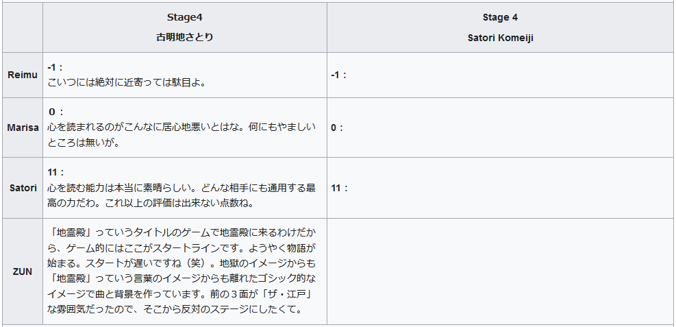 https://en.touhouwiki.net/wiki/Strange_Creators_of_Outer_World/Introduction_of_Previous_Works/Subterranean_Animism/Cross_Review – This one doesn't have an English translation (!?) so all you can tell is that Reimu gave Satori a -1 out of 10 and Satori gave Satori an 11 out of 10.