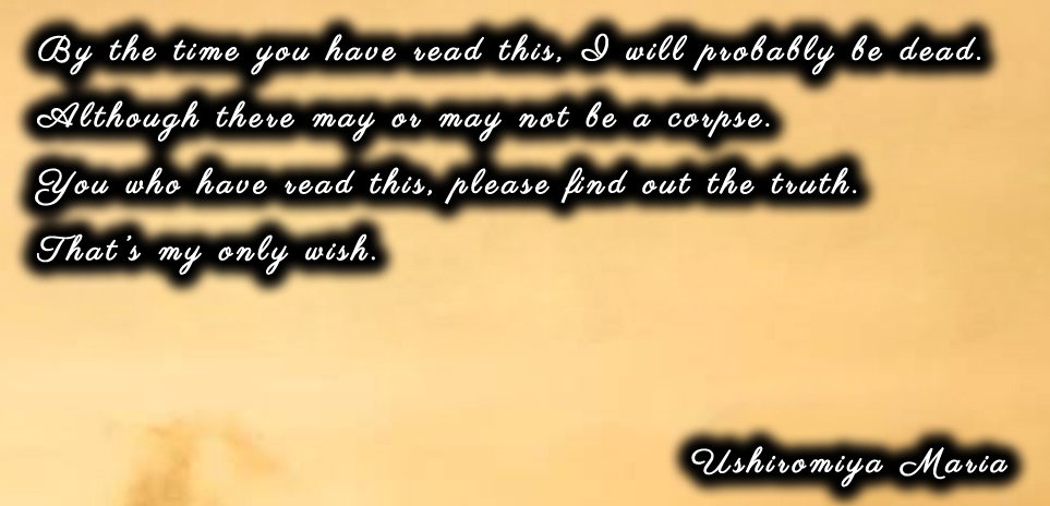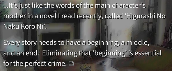 I can't BELIEVE Umineko (the game this thread is about) so swiftly flat-out no-shame spoils the ending of Higurashi in truly the most fanservice manner. Currently patting my head for how lucky, cautious, and sexually attractive I was to have arbitrarily chosen Higurashi first.