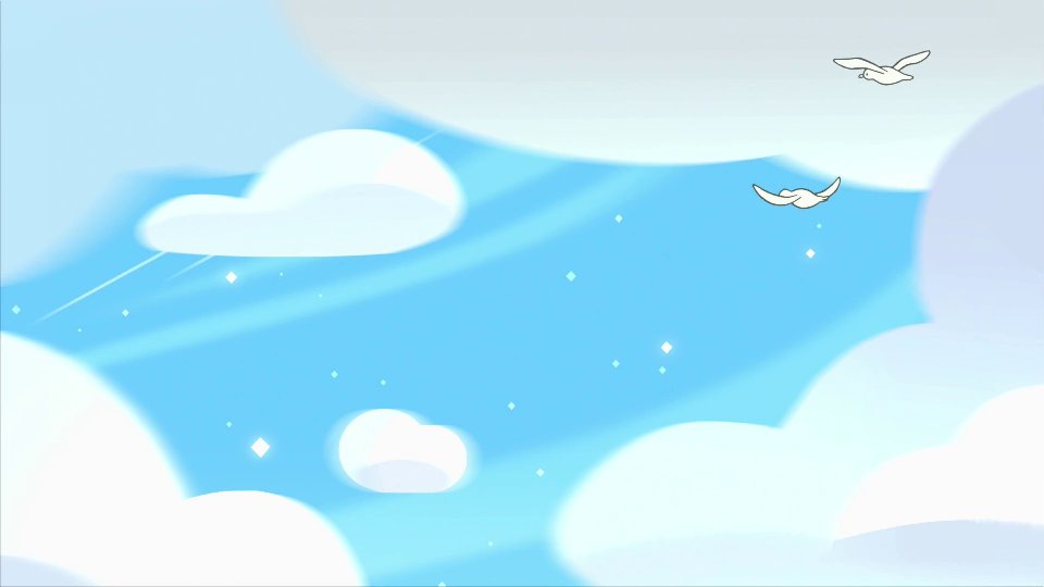 I love the little decision that, in background art, the stars are visible during the day, like the moon. Not only does even the blue sky sparkle in this glittery world, but it also signifies that space, the series's invasive fantasy realm, is constantly looming overhead.