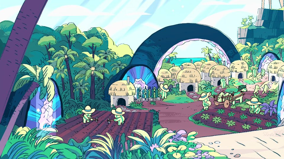 After the more tonally grounded (more or less) episodes of season 2, I liked the unexpected Adventure Time-esque watermelon village Steven visits in dreams in 3-1, made from prior S1 elements (the island from 1-30 and the watermelon people from 1-34) united into a strange whole.
