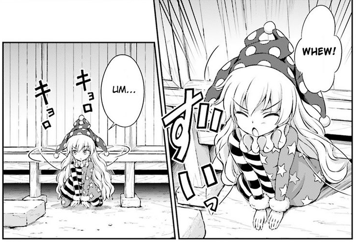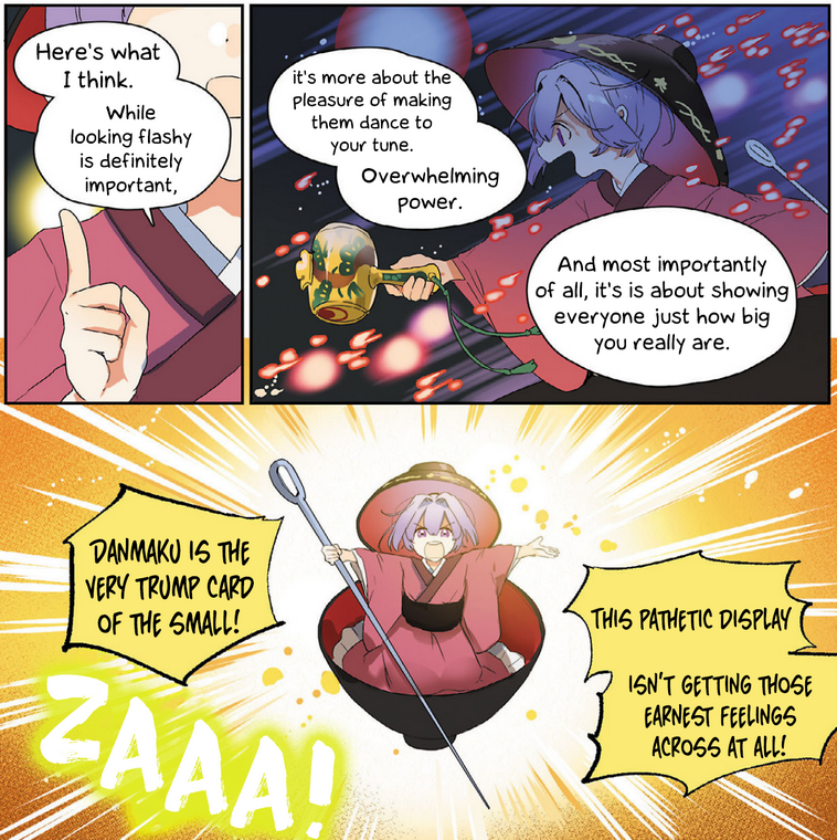 This comic is also notable for expressing Shinmyoumaru's personal philosophy of danmaku as an equalising form of combat, which may be the only interesting characterisation she has ever received in any ZUN-written work.
