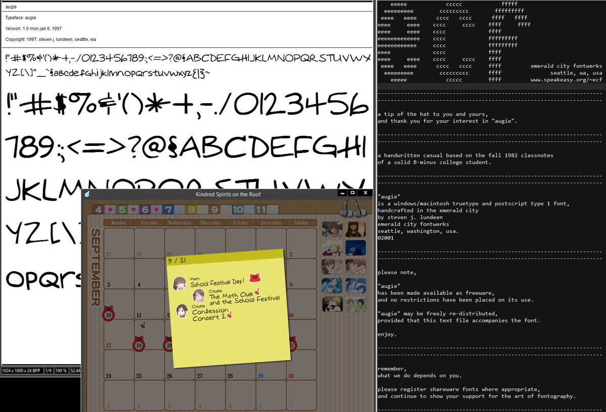 When you own a computer, you sometimes just learn stuff while trying to live your life. Today I learned that Kindred Spirits On The Roof's English release (bottom, 2016) contains the font "augie" (left, 1997) as well as the font's very 90-style laid-back Read Me (right).