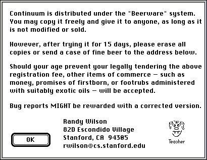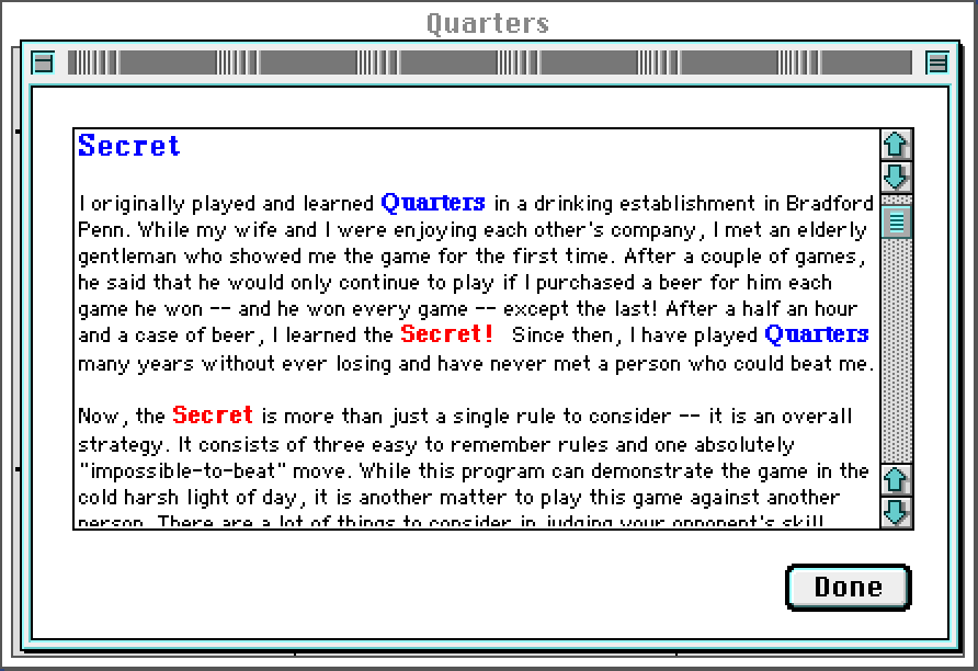 What's interesting, though, is how its "shareware fee" is marketed. The game, simple as is, has an optimal solution that the AI uses, such that the player usually CANNOT win against it – and this is gussied up as "The Secret" (complete with testimonial) which Tedd sells for $5.