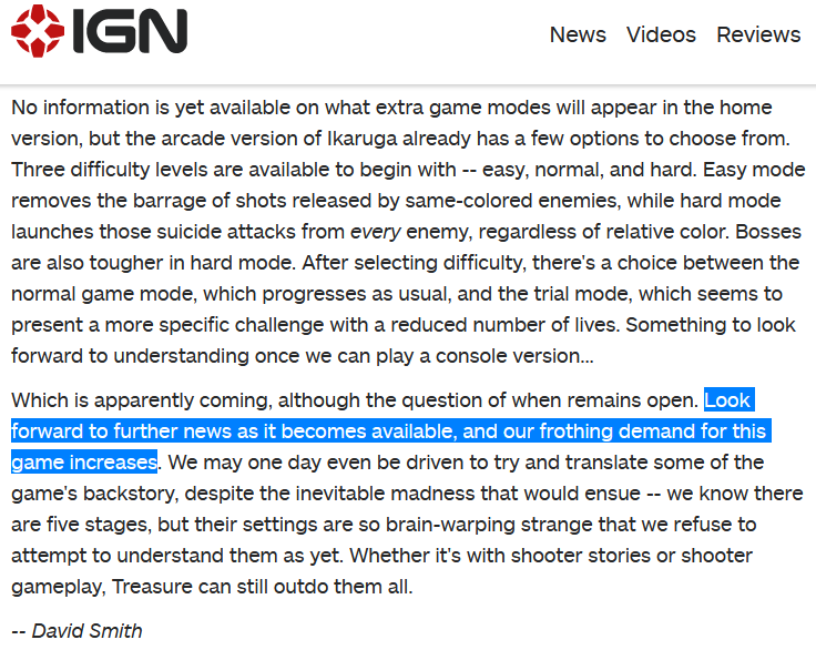 Many of you know of the "our frothing demand for this game increases" meme (right) but not necessarily aware its original context was a sarcastic half-sentence from a 2002 news article that isn't even a review (left, https://www.ign.com/articles/2002/04/12/ikaruga-2) which makes it even more pathetic.