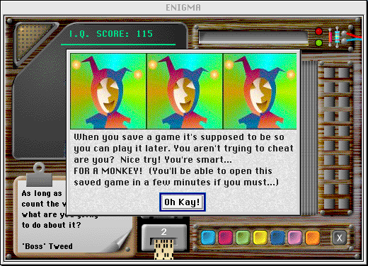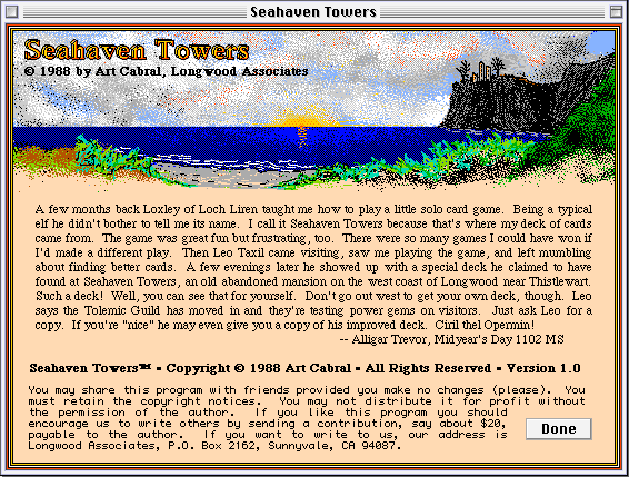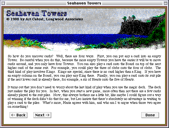 For a long time I'd appreciated this shareware solitaire game's cute little framing story (extending into the instructions)… however, when I actually tried playing it, it turned out to just be Worse FreeCell. Very disillusioning.(https://en.wikipedia.org/wiki/Baker%27s_Game)
