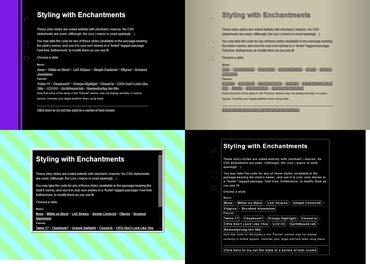 I've added another example story now, showing ways to style a page using just the (enchant:) macro and other macros. I might do another one that uses actual CSS, but this demonstrates what sort of styling features I've pushed into the macro language.