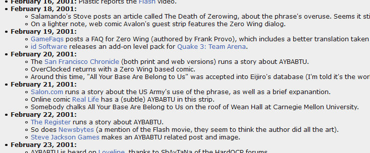 I've been reading a lot of Everything2 nodes lately. Current surprising find is that the "All your base are belong to us" node contains this shockingly detailed event timeline writeup https://everything2.com/user/wh00t/writeups/All+your+base+are+belong+to+us